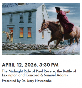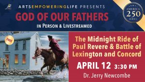 On Sunday, April 12, 2026, Dr. Jerry Newcombe of Providence Forum spoke on the Midnight Ride of Paul Revere, Lexington/Concord, and Samuel Adams. This was part of the America at 250 Series for Arts Impacting Life, based in Cape Cod. The talk can be seen/heard here.